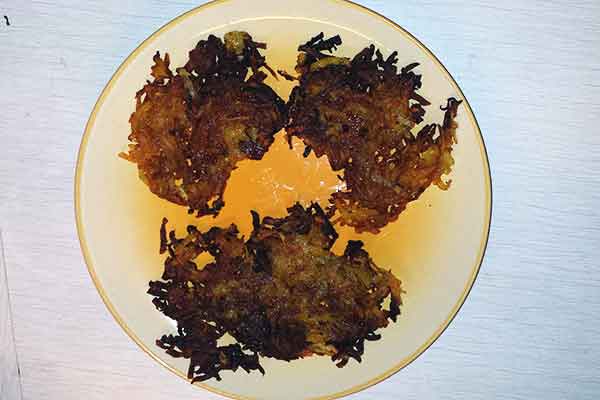 Das Butterschmalz in einer Pfanne erhitzen, die Rösti in die Pfanne geben und ein wenig auseinander drücken, dann bei mittlerer Hitze braten bis sie goldbraun sind. Herausnehmen und auf Küchenpapier abtropfen lassen.