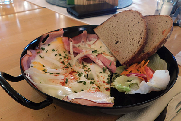 Andreas und Simone bemühen sich bei regionalen Partnern einzukaufen und möglichst regional und saisonal zu kochen. Es schmeckt. Wer übernachtet, kann auch das ausgezeichnete und reichliche Frühstück genießen und sich dabei süße oder pikante Varianten aussuchen.