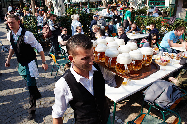 Das Schweizerhaus ist zum Synonym für gepflegtes Bier und resche Stelzen geworden. Wieselflinke Kellner bringen auf großen Tabletts die Krügel (1/2 l) mit frisch gezapften Budweiser vorbei und man tut gut daran, sich gleich eines davon auf den Tisch zu ordern. Wünsche nach einem Seidel (kleines Bier), alkoholfreien Bier oder Kracherl (Zitronenlimo) werden zwar auch erfüllt, dauern aber doch um einiges länger und bei Bestellungen eines kleinen Biers kann man schon hin und wieder die Antwort des Kellners: „Meldest Dich halt wieder, wenn Du Durst hast“ erhalten, beides ist nicht böse gemeint und wenn Sie sehen, welche große Anzahl von Gästen betreut wird, können Sie den Mann gleich viel besser verstehen. Schließlich gelten auch die Kellner des Schweizerhauses als Wiener Originale.