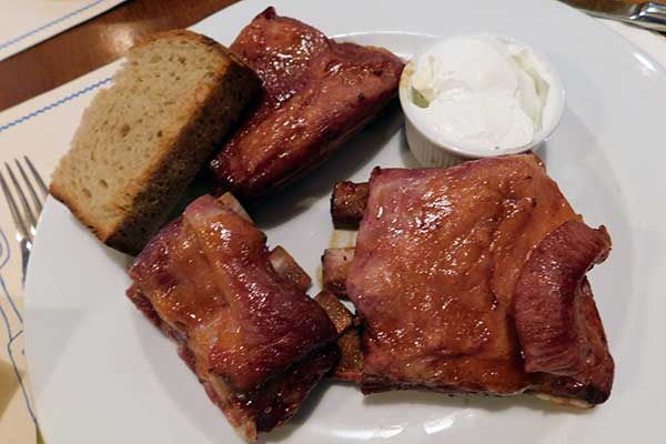 Wir wollten natürlich unbedingt tschechische Spezialitäten genießen. Eigentlich hatte ich mir eine kleine Portion vorgestellt und so stachen mir die gegrillten Rippchen mit Brot und Sauerrahm ins Auge. In Österreich bedeutet es viel Knochen und wenig Fleisch. Aber: hier sind wir in Tschechien und die Rippchen unterscheiden sich in Zubereitungsart und Größe entschieden. Hier sind die Knochen mit viel Fleisch, das durchaus auch Fett beinhaltet, leicht geselcht, gekocht, dann mit einer Marinade überzogen und nur kurz gegrillt. Dazu einen halben Meter getostetes, resches Brot und der schon erwähnte Sauerrahm. Wieder nix mit den kleinen Portionen. Allerdings muss gesagt werden, dass dieses Gericht natürlich zum Bier hervorragend passt und auch für einen größeren Hunger gedacht ist.