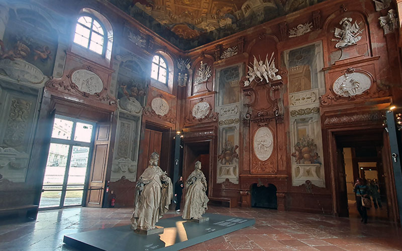 Eine Ausstellung im Belvedere ist immer wieder auch mit dem Bewundern der Ausstellungsräume verbunden. Man steht staunend und fotografierend im Spiegelsaal oder – wenn man nun die Messerschmidt-Ausstellung besucht im Marmorsaal und bewundert die Ausführung ehe man sich den Werken des ausgestellten Künstlers zuwendet.