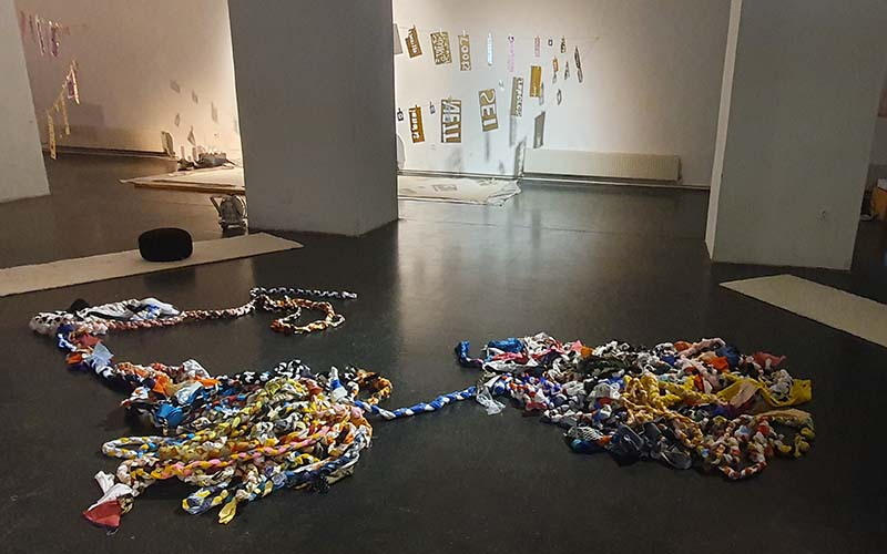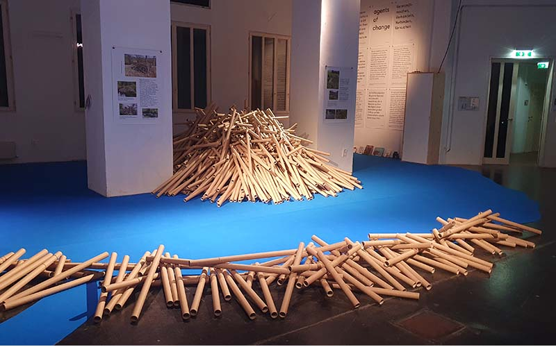 Last but not least geht es nun an das letzte Projekt, die letzte Installation und auch hier ist mitmachen gefragt. Konnte man beim Beaver Lab mit verschiedenen Ansichtskarten (sei es als Biber Jüngling, als Eisvogel oder einiges mehr) seinen Platz im Biber Habitat finden oder beim „Widerstand“ Protest-Plakate basteln, geht es bei diesem Projekt von Marieluisa Lenglacher, Johanna Preissler, Carina Riedel und Elisabeth Smejkal – als Teil der Common Ground Group ums Flechten eines Teppichs.