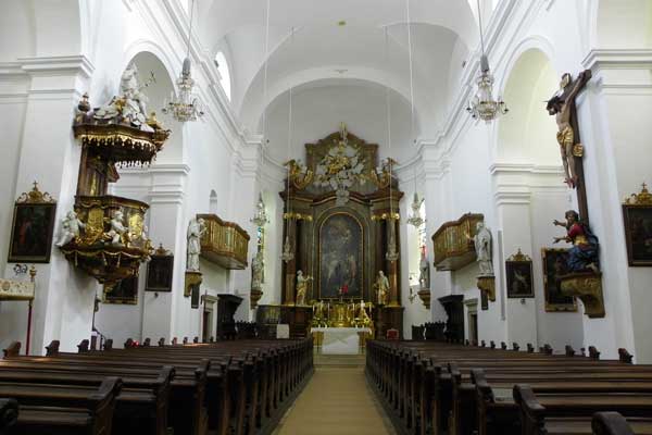 Das Chorgestühl stammt aus 1657 und kam aus dem ehemaligen Kapuzinerkloster, das 1788 von Kaiser Joseph II. aufgelöst wurde. Die Kirchenbänke sind aus 1766.