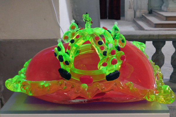 Vasen, Gefäße, eine Krippendarstellung, Pferdeköpfe (ein Lieblingsmotiv von Pačinek), Bilder und deren Pendants in Glas, bei der Orgel hängt ein weiterer Kronleuchter nach einem Entwurf von Barbora Jarošova; ja, es gibt sogar das Corona-Virus in Glas dargestellt, umringt von einer einmaligen Serie von Antiviren, die das verflixte Virus besiegen sollen. Einmalig.