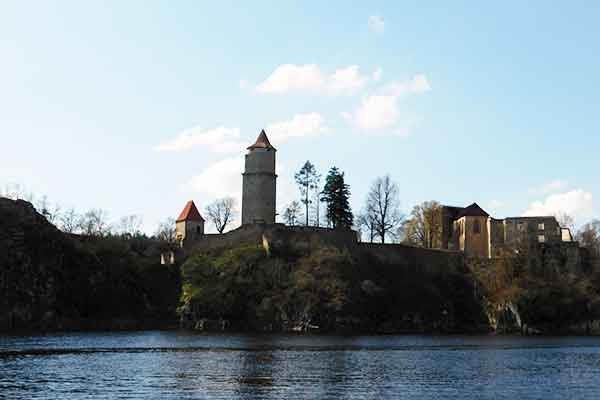 Auf einem Felsensporn über der Talsperre Orlík ragt das Schloss ins Land, das bereits als königliche Burg in der zweiten Hälfte des 13. Jahrhunderts gebaut wurde und damals dem Schutz einer Furt diente. Damals, in der Regierungszeit von Přemysl Ottokar II. , wurde die Burg an dieser Stelle neu errichtet und diente auch zur Einhebung des Zolls an der Moldau. Zwischen 1288 und 1289 war die Burg im Besitz von Zawisch von Falkenstein, der sich damals im offenen Kampf gegen den Vormund von Wenzel II., dem Brandenburger Marktgraf Otto IV. befand.
